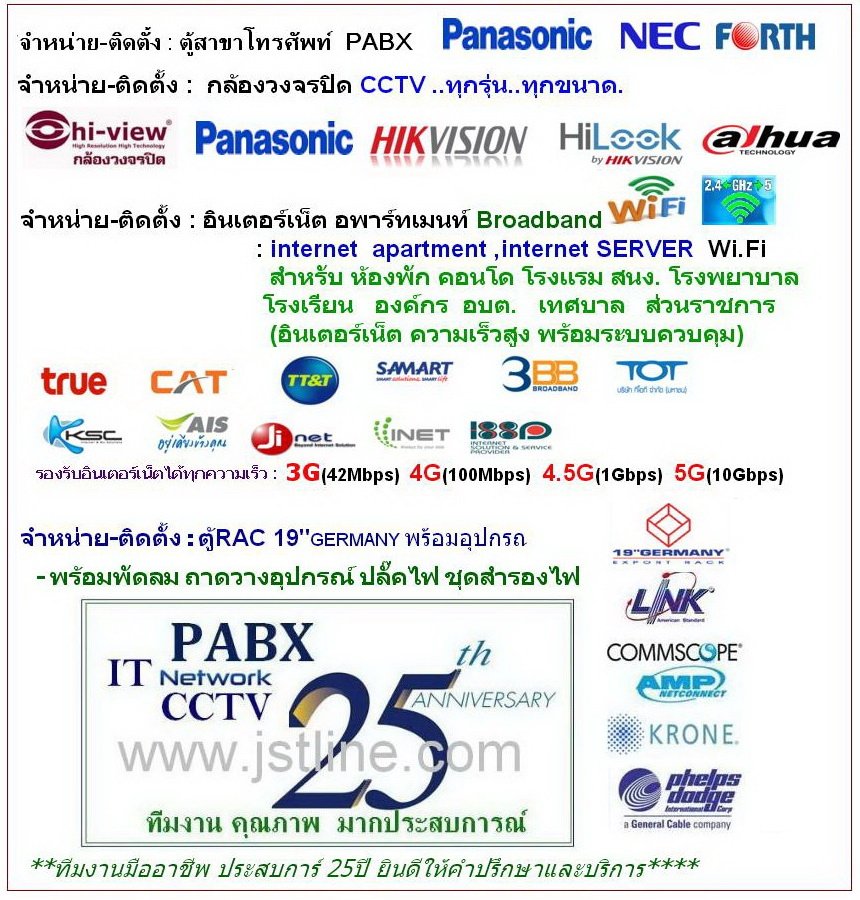 จำหน่าย ปลีก-ส่ง ติดตั้ง ซ่อม : ... ตู้สาขาโทรศัพท์ PABX FORTH NEC Panasonic , กล้องวงจรปิด CCTV hiview Panasonic HiKVISION DAhUA , internet Apartment Wi-Fi SERVER อินเตอร์เน็ต อพาร์ทเมนท์ ,ห้องพัก , คอนโด โรงแรม สนง. ,ระบบคีย์การ์ด ฟิงเกอร์สแกน เฟสสแกน ควบคุมประตู KEY CARD , Software CRM บริหารจัดการ SME , สายเคเบิ้ลโทรศัพท์ สายแลน RG-6 อุปกรณ์ IT Network " อุปกรณ์ ตู้ RACK 19”. ไฟฉุกเฉิน สัญญาณเตือนภัย ,UPS สำรองไฟ ,งานเดินสาย ระบบแลน โทรศัพท์ ,ระบบไฟฟ้าภายใน,จัดหาอุปกรณ์